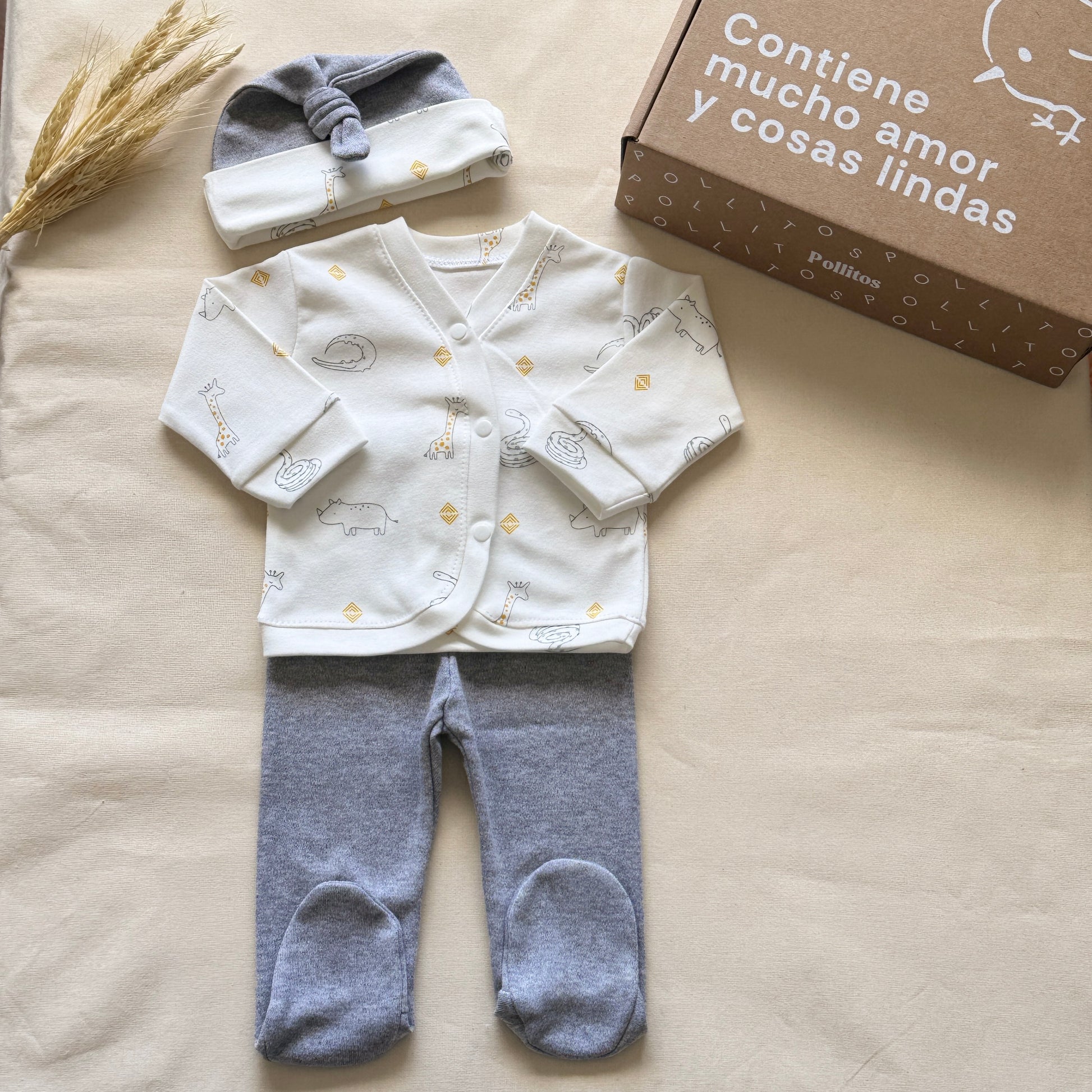 Set algodón - Blanco con animalitos pantalón gris